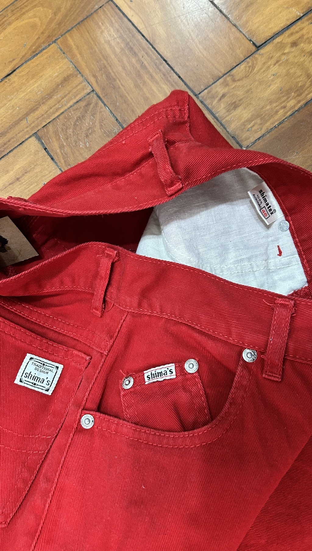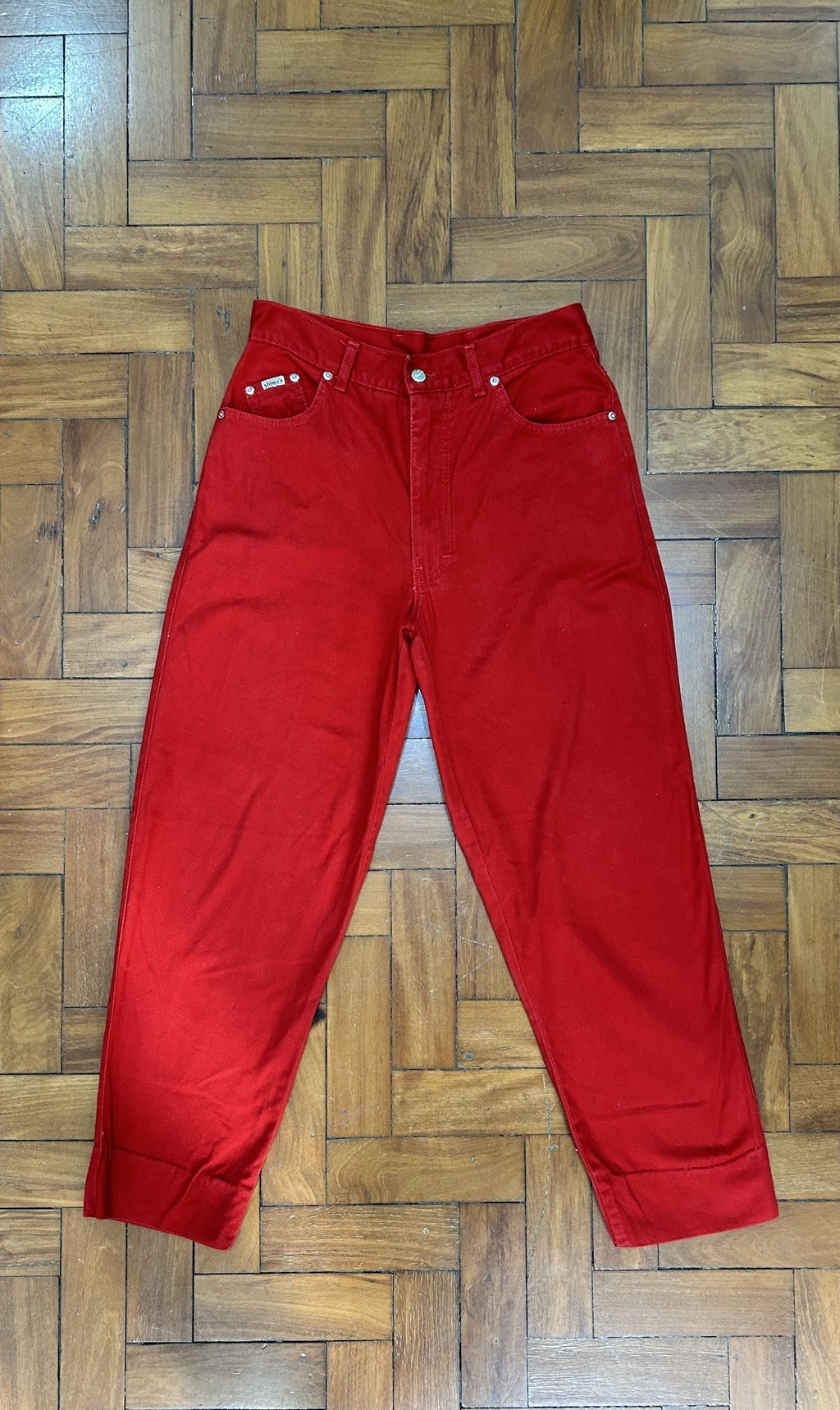 Tamanho 46, modelagem pequena, conferir medidas. Fechamento em zíper e botão. Possui bolsos frontais e atrás. Passador de cinto. Tecido: algodão. CONDIÇÃO: 9/10 não possui barra original.