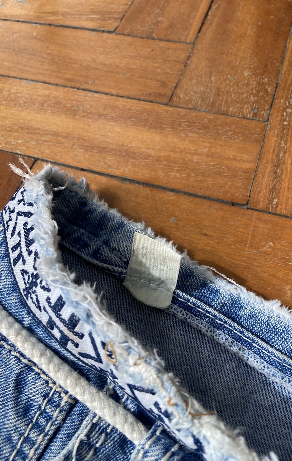 Fechamento parcial em botão. Possui cordão para ajuste da cintura. Bolsos frontais e atrás. Etiqueta informando tecido apagada. CONDIÇÃO: 9/10 manchas de tempo.